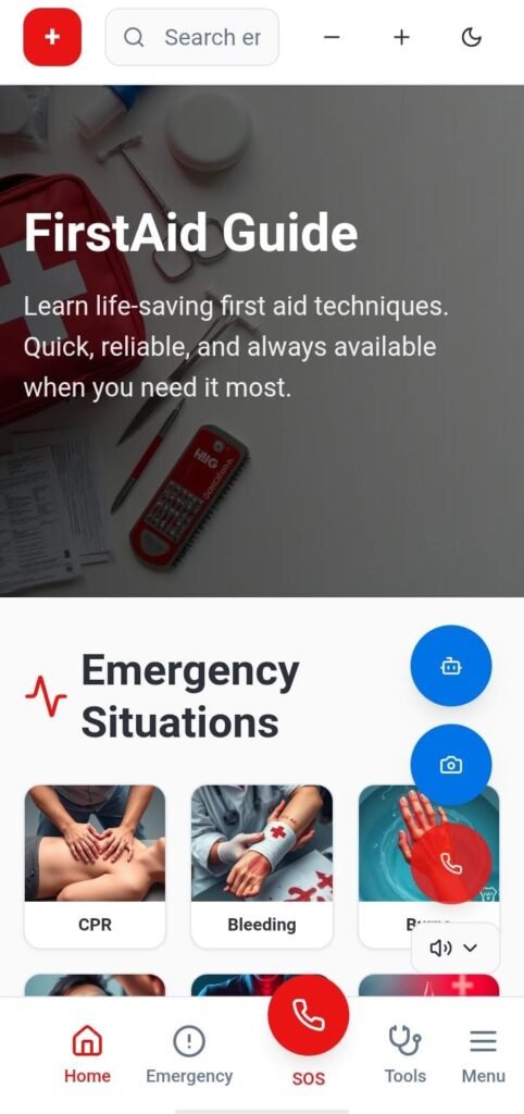 Step-by-step voice instructions, offline access, emergency dialer integration, and quick-search for common injuries (burns, CPR, choking).